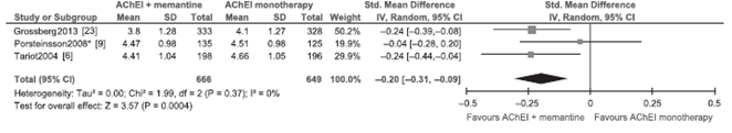 圖2聯(lián)合膽堿酯酶抑制劑加美金剛的治療對(duì)比膽堿酯酶抑制劑單獨(dú)治療對(duì)行為和情緒作用效果的薈萃分析結(jié)果(NPI)。 *分組的中度患者數(shù)據(jù)取自溫布萊德等人的薈萃分析[28]。 AChEI,乙酰膽堿酯酶抑制劑; NPI,神經(jīng)精神庫存;標(biāo)準(zhǔn),規(guī)范。