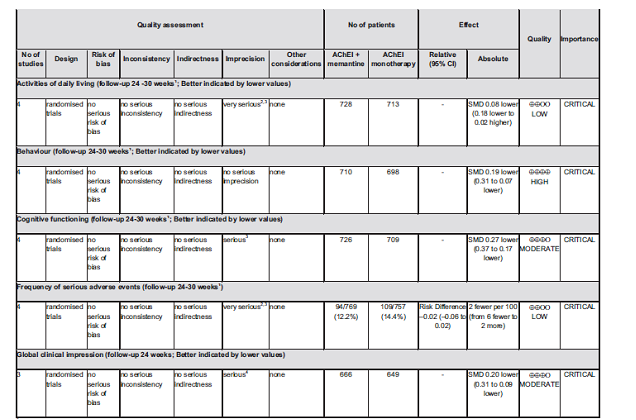 每個(gè)成果的起點(diǎn)水平高,但對(duì)ADL和不良事件卻降的很低,因?yàn)樗C萃分析置信區(qū)間包含正、負(fù)值和置信間隔是寬的(圖1和5)。對(duì)于認(rèn)知功能和GCI降至中度必須是由于效果估計(jì)嚴(yán)重的不精確性具有寬的置信區(qū)間。行為沒有了降級(jí)需要。