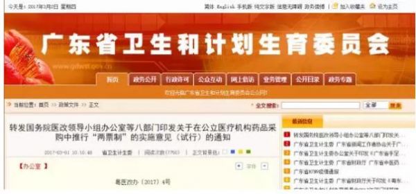 3月2日,廣東省衛(wèi)計委官網(wǎng)轉發(fā)《國務院醫(yī)改領導小組辦公室等八部門印發(fā)關于在公立醫(yī)療機構藥品采購中推行“兩票制”的實施意見(試行)的通知》,這預示著,醫(yī)藥大省廣東啟動兩票制的步伐在加速。