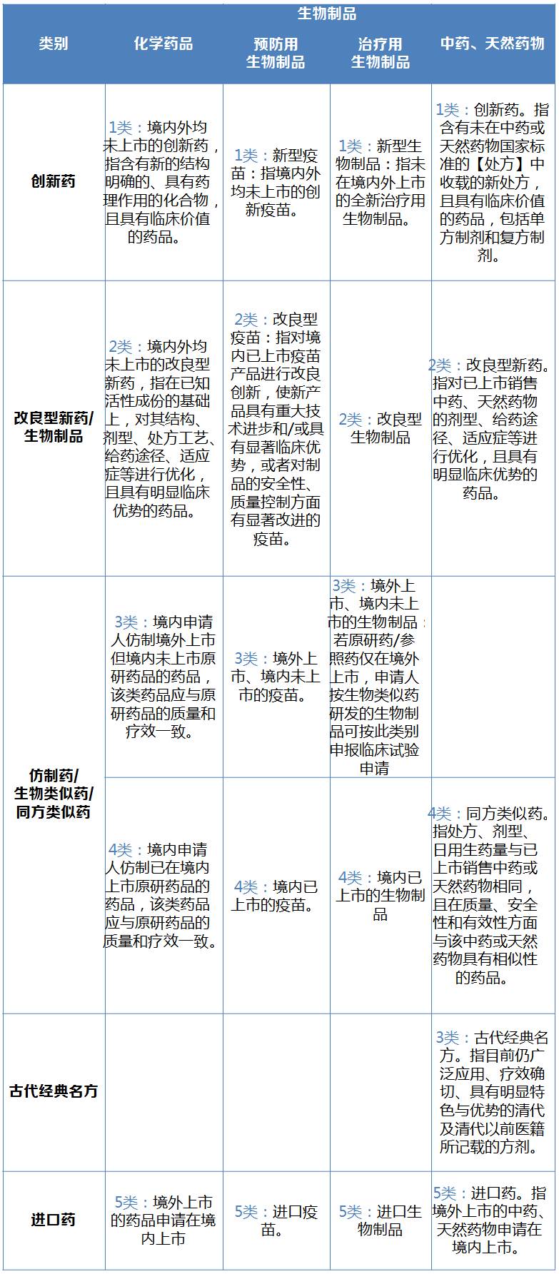 《藥品注冊管理辦法(修訂稿)》公布了最新的生物制品和中藥、天然藥物的分類,分類方法與此前公布的化學藥品分類方法基本相似,以創(chuàng)新藥、改良藥和仿制藥進行分類,中藥、天然藥物單獨設(shè)定了個新3類古代經(jīng)典名方。生物制品分為預(yù)防用生物制品和治療用生物制品。