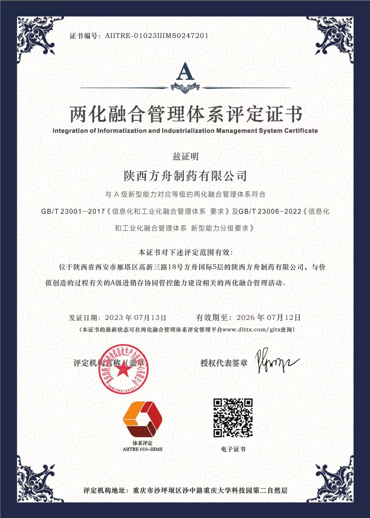 陜西方舟制藥榮獲兩化融合國家級認(rèn)證證書